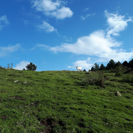 Passat el coll continuem pujant, ara per un corriol que s’endinsa a estones dins de la pineda de pi negre i a estones s’obre a espais oberts de pastura.